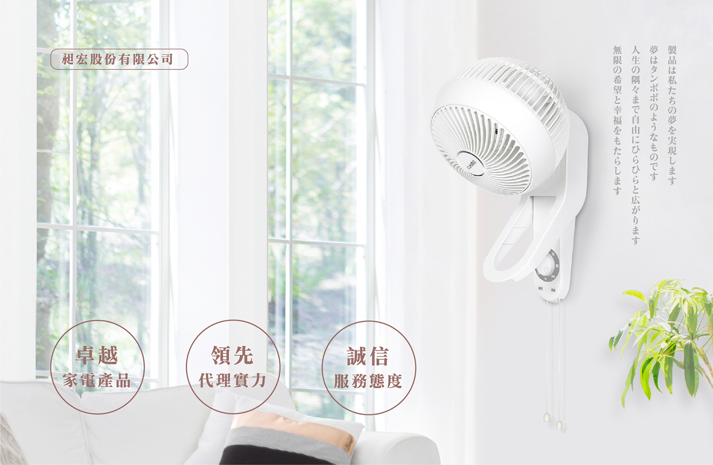 昶宏家電始於追逐夢想與散播希望,產品是我們夢想的實現,夢想就像蒲公英,任意飄揚散播在生活中每處角落,為每一個你帶來無限希望與幸福。