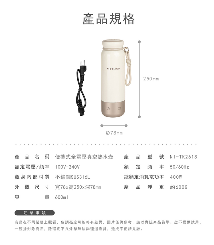 【NICONICO】便攜式全電壓真空熱水壺NI-TK2618