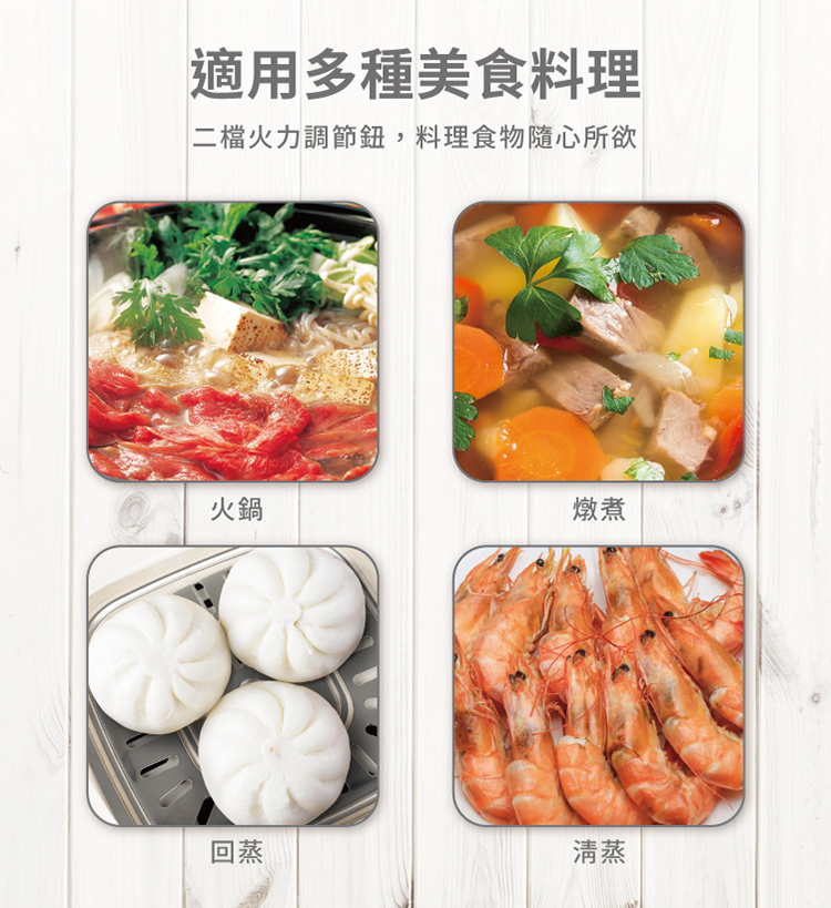 • 多樣化料理,燉、煮、煎、炒、炸、蒸