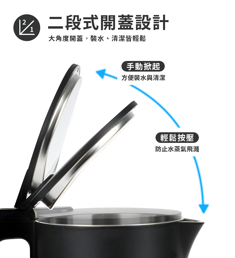 • 二段式開蓋設計,防止水蒸氣飛濺