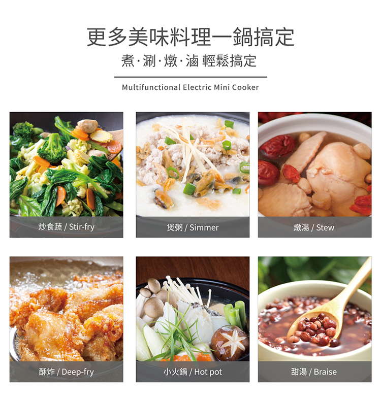 • 一鍋多樣化料理,煮、涮、燉、滷