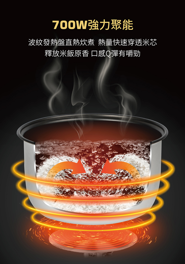 • 波紋發熱盤,均勻受熱直達米芯