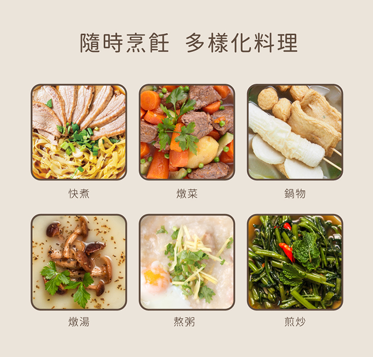 - 多樣化料理,燉、煮、煎、炒