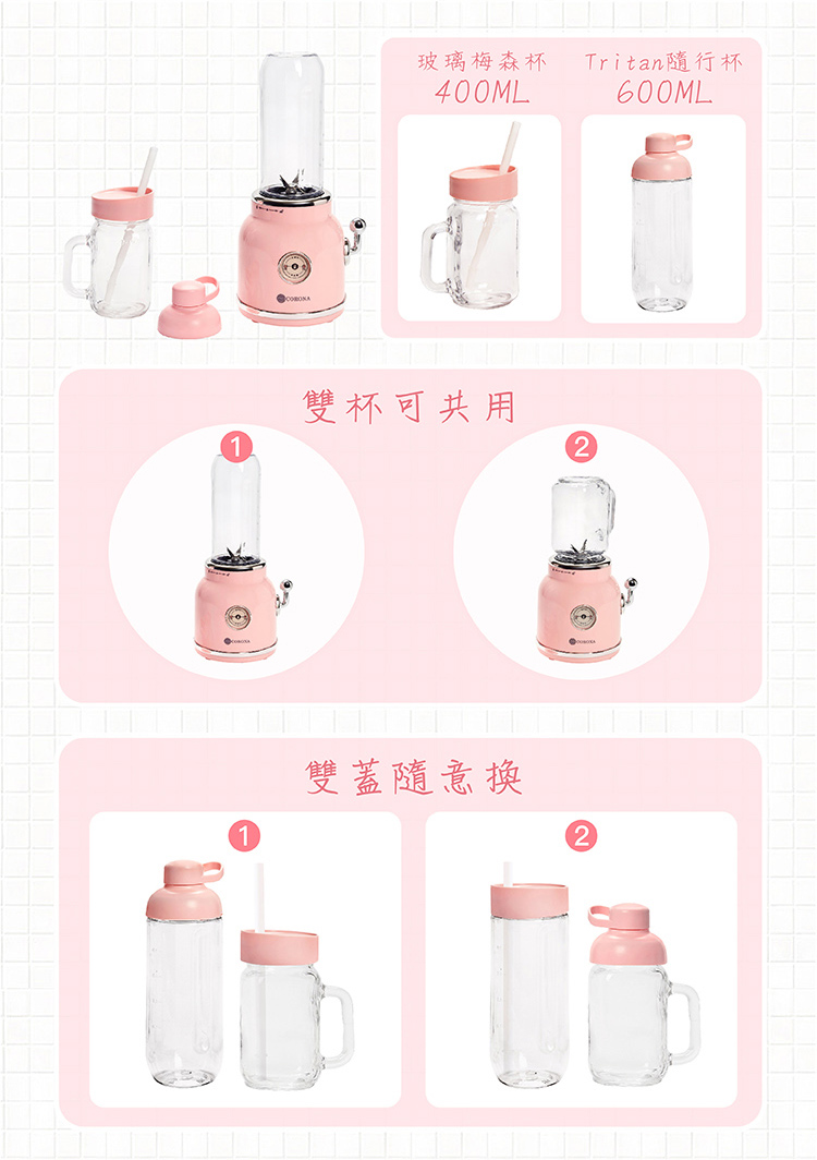 • 一機雙杯,玻璃梅森杯+Tritan隨行杯附環保吸管