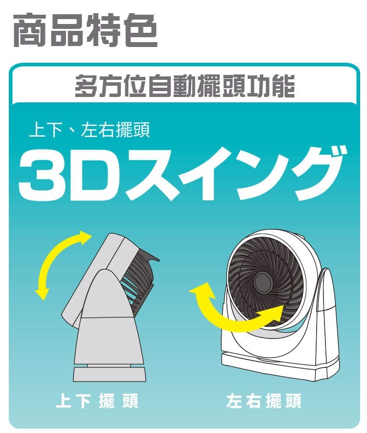 • 多方位擺頭功能,上下、左右自動/3D自動擺頭