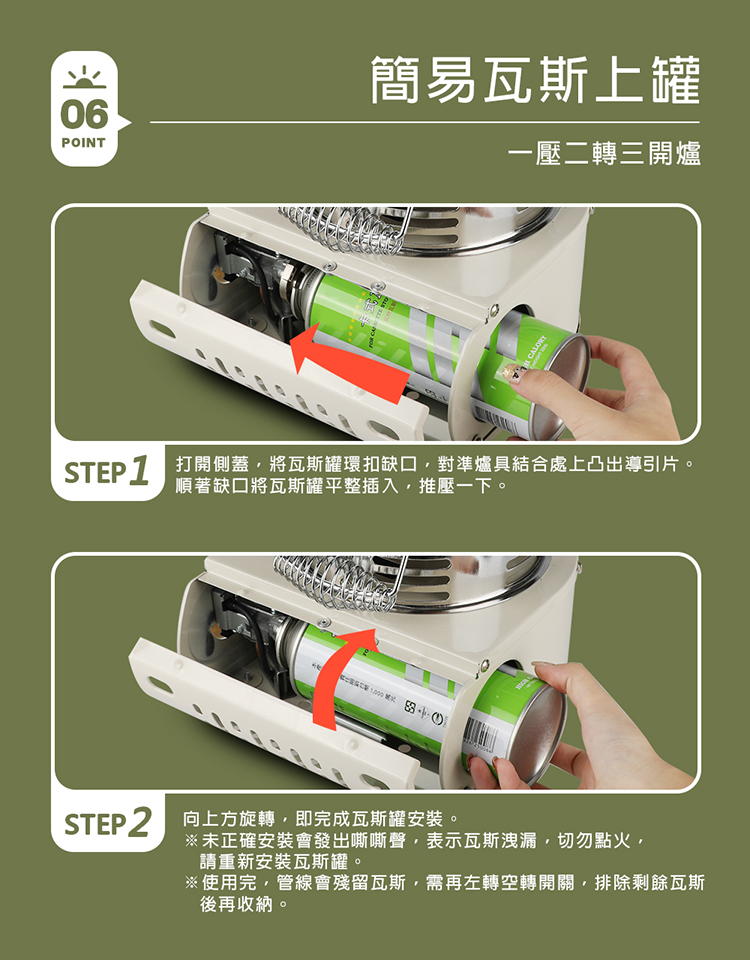 • 簡易瓦斯上罐,一壓二轉三開爐
