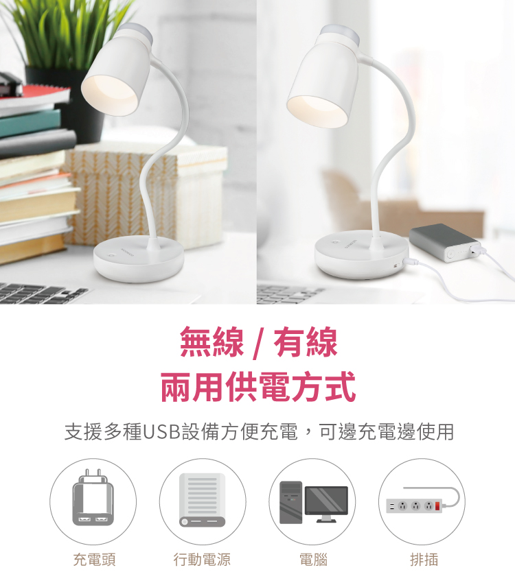 • 兩用供電方式 USB電源線/電池