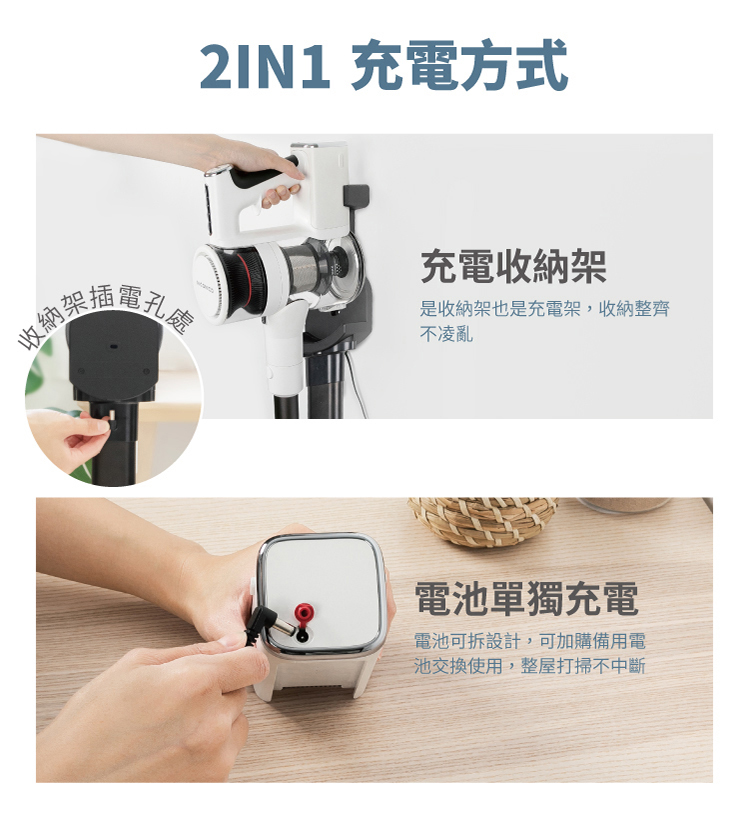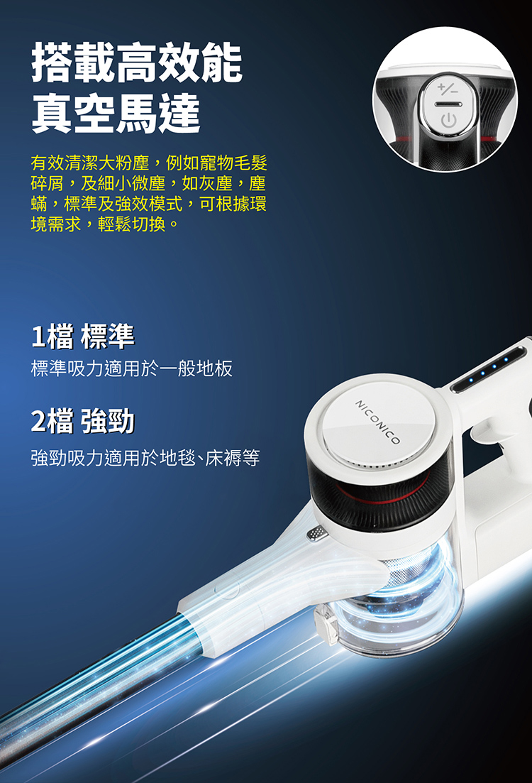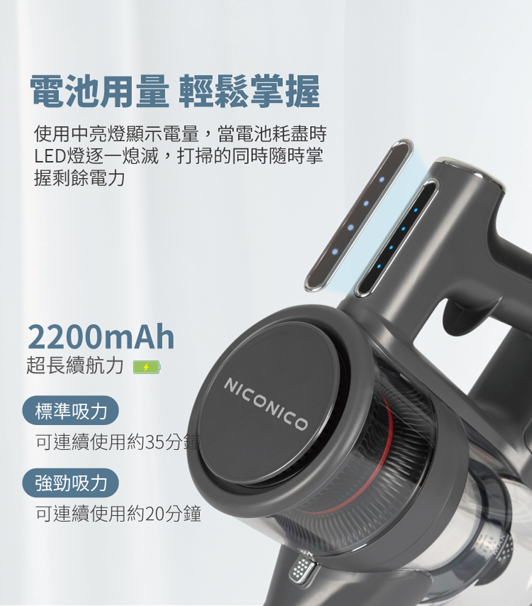 • 兩段強弱吸力控制,LED電量顯示