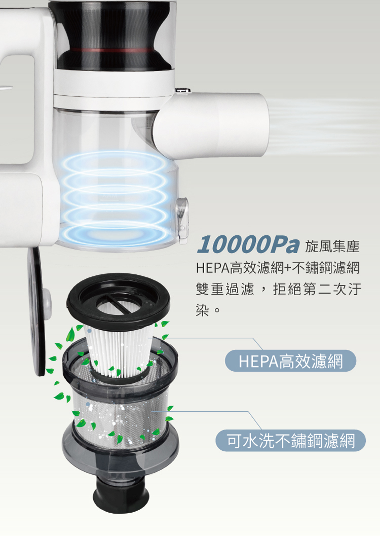 • 強勁吸力,旋風式吸塵
