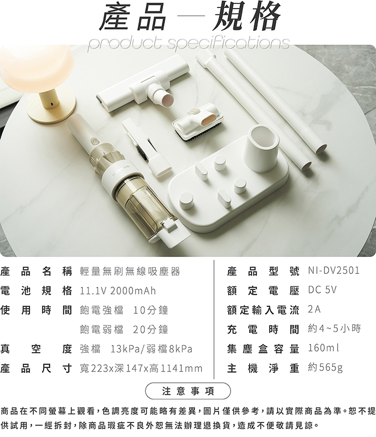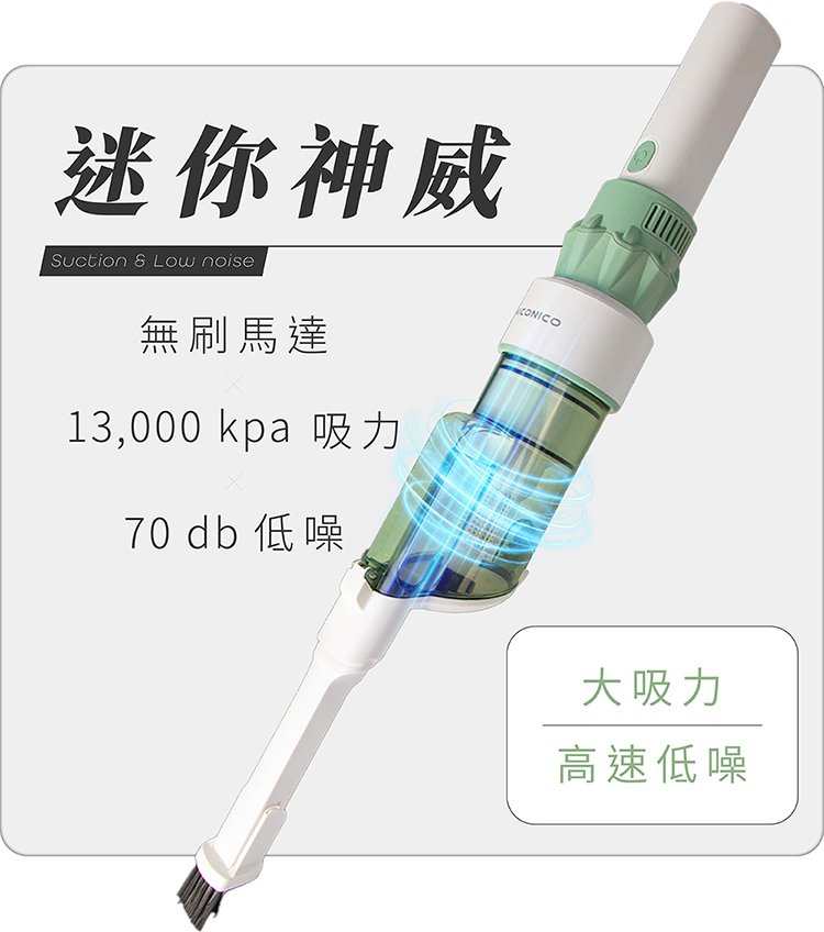• 無刷高速馬達,13Kpa強勁吸力