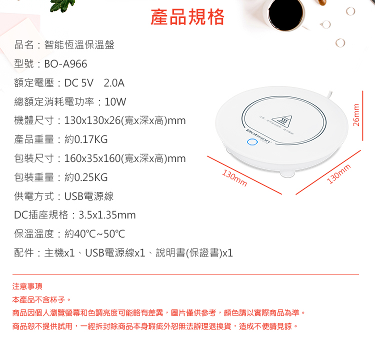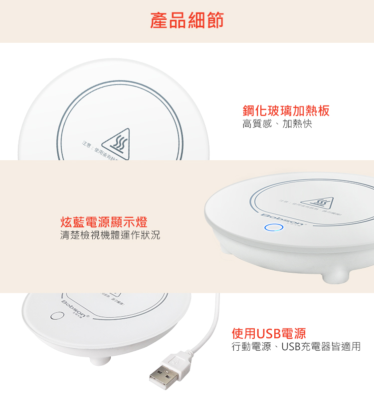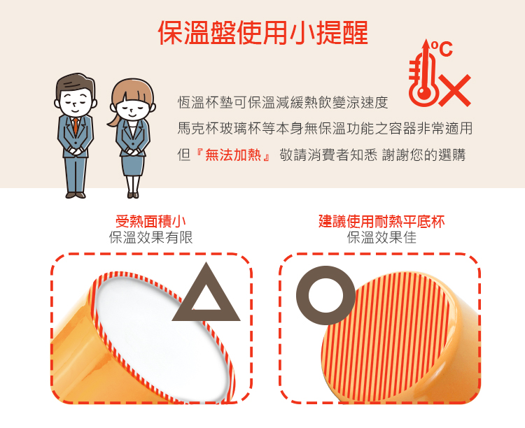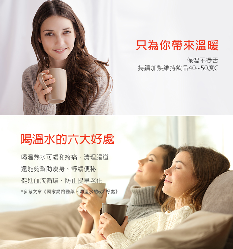 • 可持續對熱飲加熱,維持飲品40~50℃