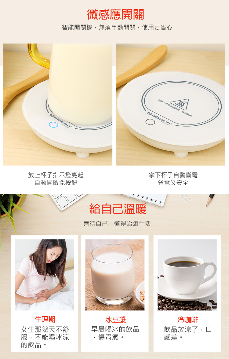 • 微感應加熱設計,放置飲品自動保溫加熱