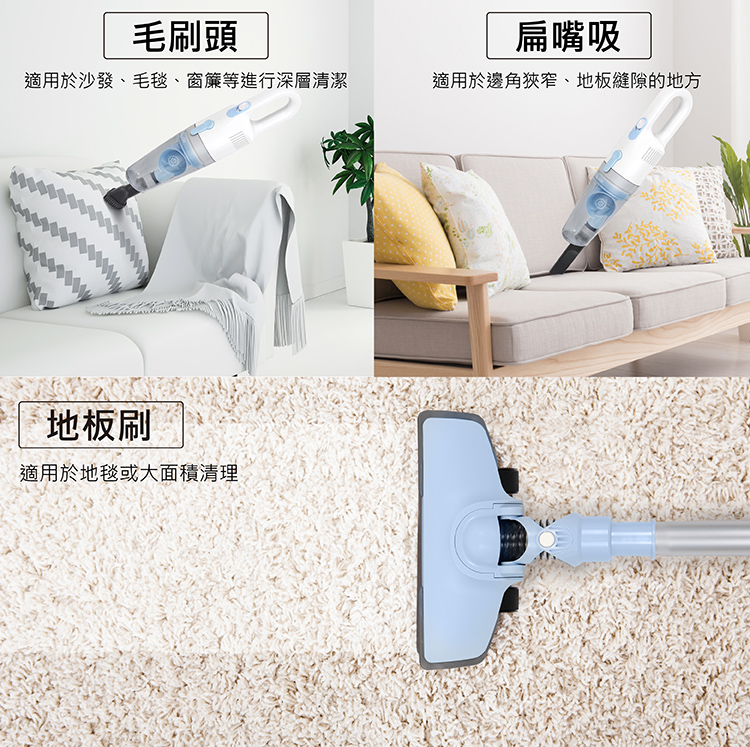 • 3組刷頭靈活運用,地刷、扁嘴吸、毛刷頭