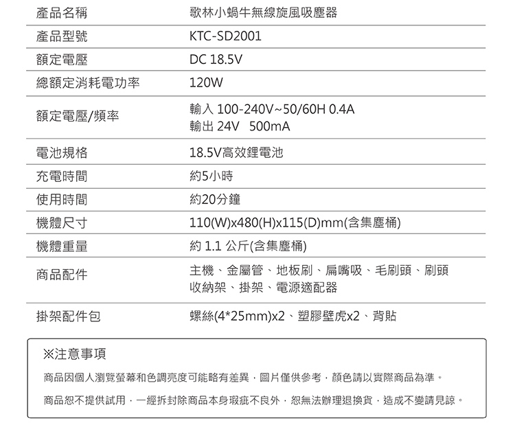 【歌林】小蝸牛無線旋風吸塵器KTC-SD2001