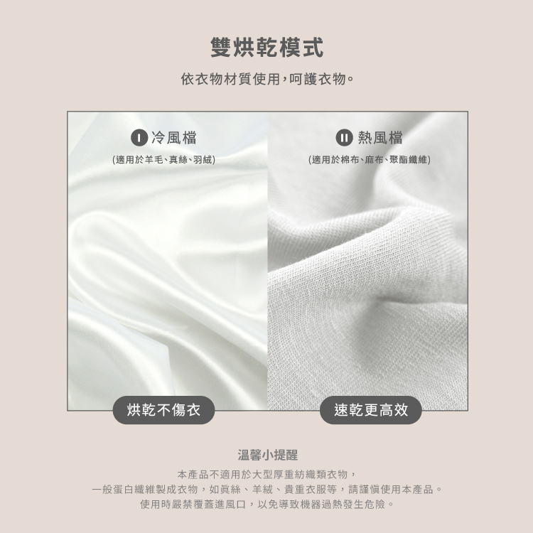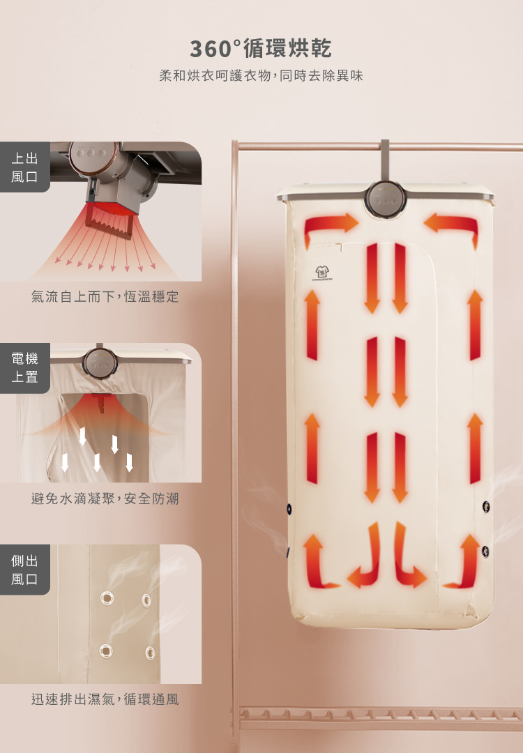 • 360度熱風循環,恆溫氣流柔和烘衣