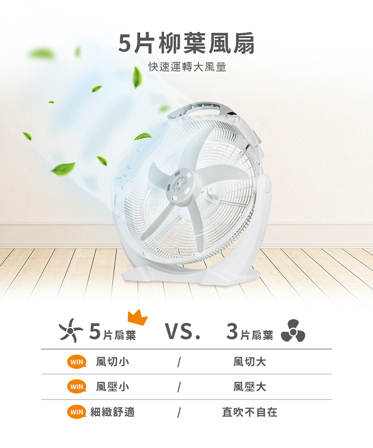 • 五片扇葉設計,強勁風速