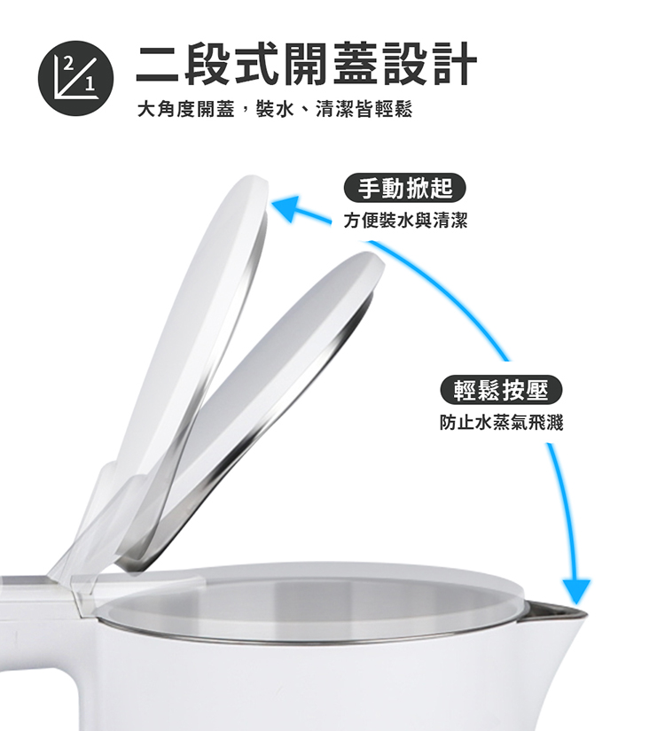 • 二段式開蓋設計,防止水蒸氣飛濺